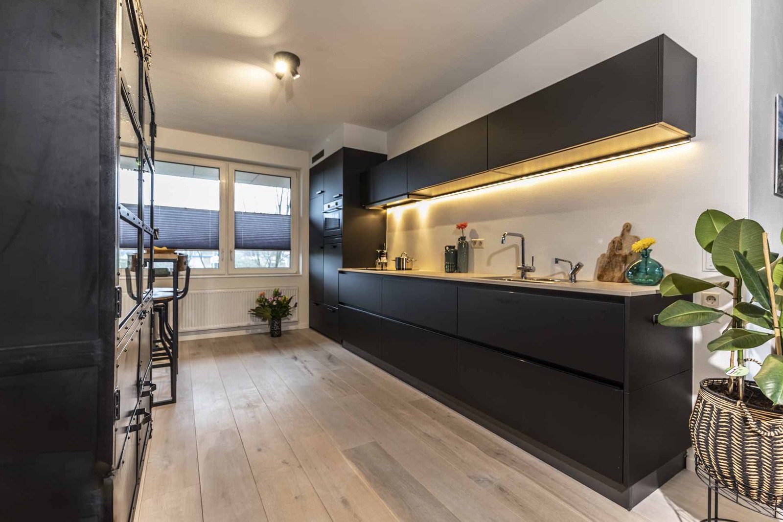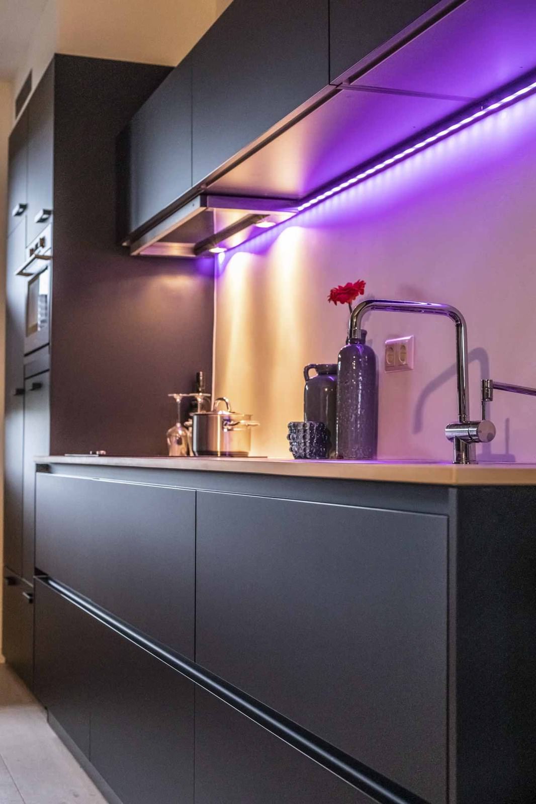 Deze mat zwarte, greeploze keuken is helemaal van deze tijd, de instelbare ledstrip zorgt er voor dat de keuken in alle sferen een goed bijpassend meubelstuk is.